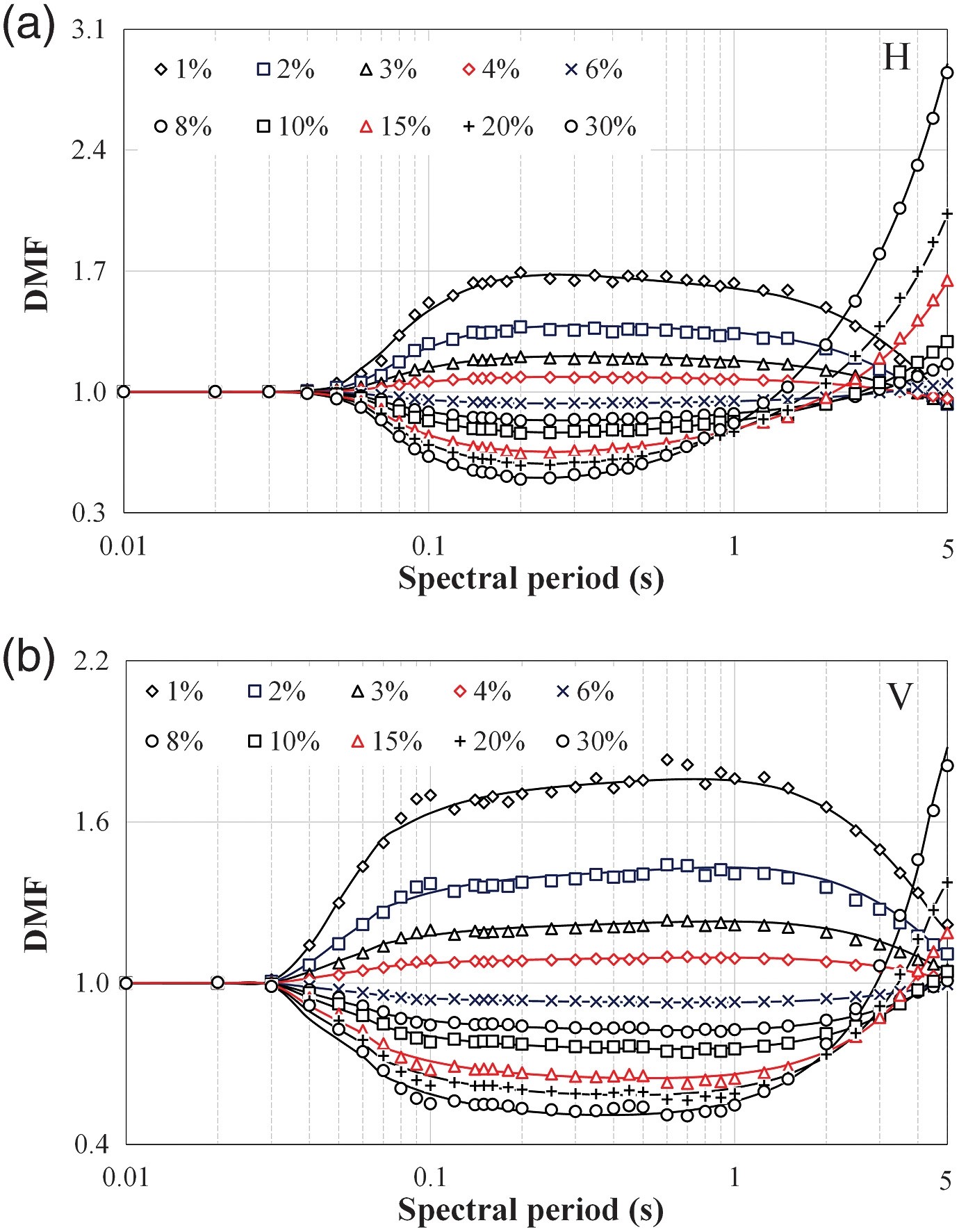 抗震規范設計譜以及地震動模型計算的反應譜通常是基于5%阻尼比給出的。而海洋結構的阻尼比并非5%,例如,海底沉管隧道、海底管道、海洋石油平臺、儲油罐、跨海橋梁等海洋工程結構的阻尼比一般小于5%,裝有隔震支座的建筑和橋梁的阻尼比要大于5%。為得到相應結構阻尼比水平下的譜值,最常用方法是建立阻尼修正系數(DMF)模型,DMF可以在5%阻尼比反應譜基礎上進行調整得到其他阻尼比水平的反應譜。
