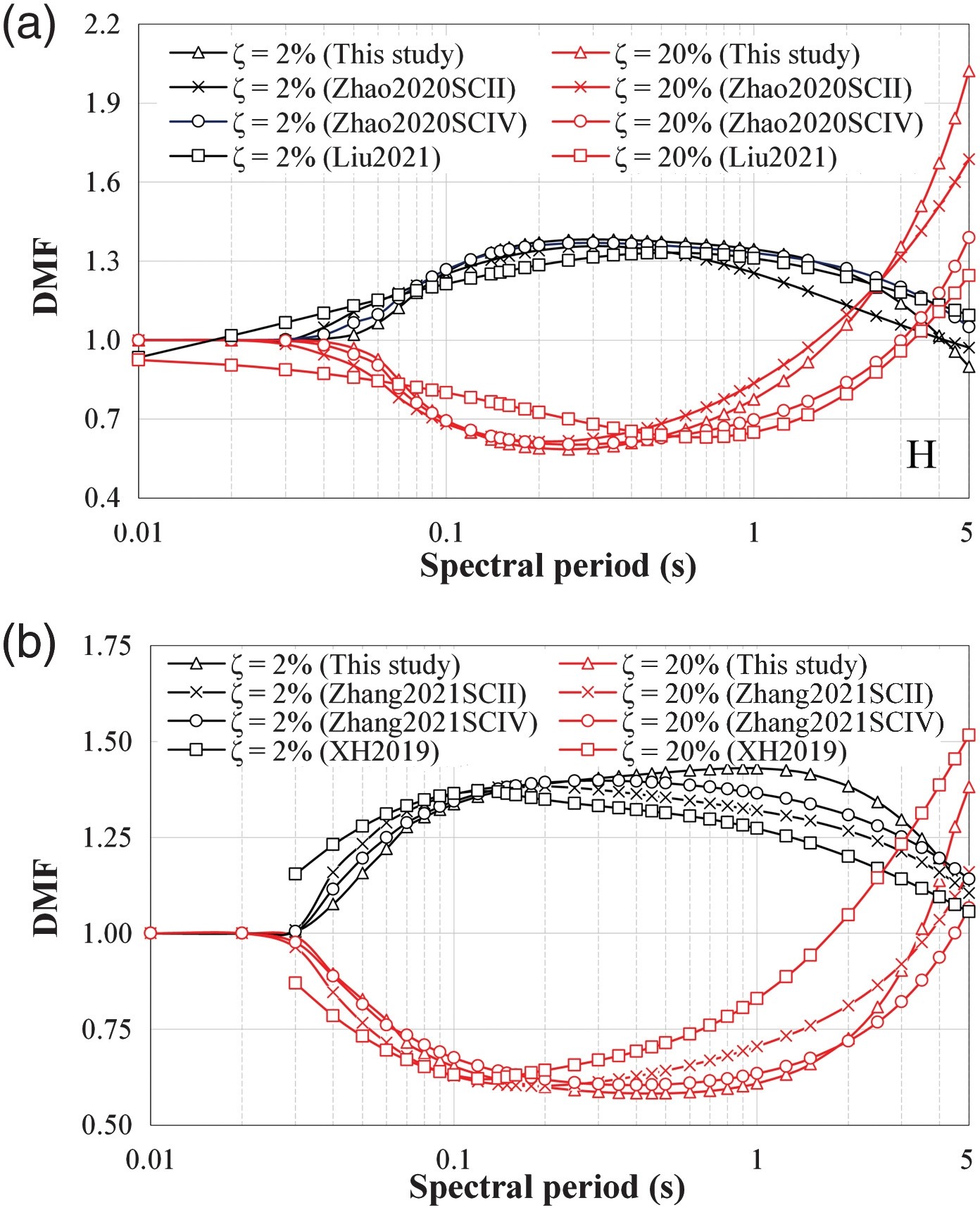 (1)海域和陸域地震動的DMF在大多數譜周期內,海域和陸域地震動的DMF差異顯著,場地條件對海域DMF的影響很小。在較短的周期內,海域模型小于陸上模型;水平分量的海域模型在長周期高阻尼比時比陸域模型大。