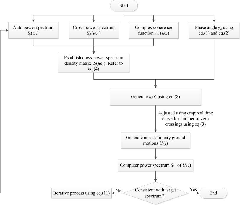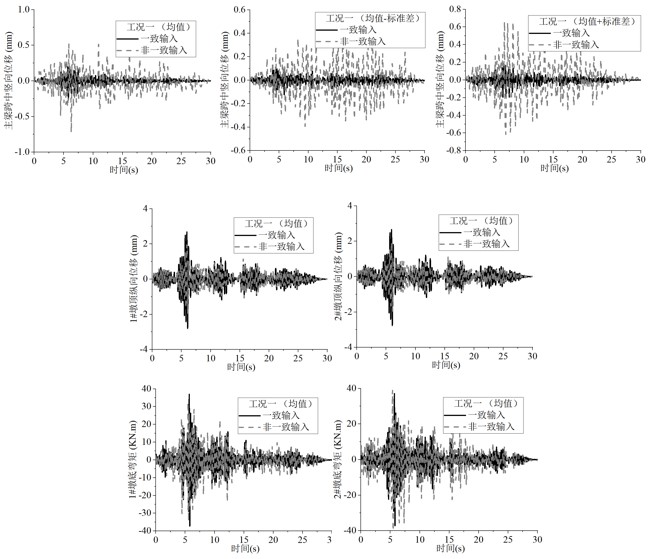 地震動的頻域非平穩性可通過累積穿零量隨時間變化進行描述,在傳統譜表達合成地震動的基礎上分別引入相位差譜和累積穿零量對合成結果進行強度、頻域非平穩化。利用CESMD數據庫中豐富的地震動記錄擬合出相位差譜隨震級、震中距變化模型,以及累積穿零量隨時間變化的經驗模型,再代入空間相干函數拓展為多點非平穩地震動,改進后方法流程如圖1。由圖2可知,所模擬的地震動時程不僅具有強度及頻域非平穩性,同時體現了空間多點的相干性。將上述合成的地震動通過一大跨橋梁進行多點地震動輸入驗證,討論了一致和非一致輸入下的結構響應差異。