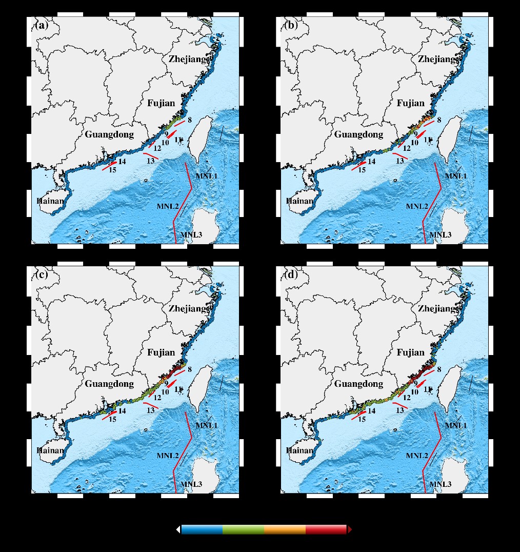 圖3 以(a)475、(b)975、(c)2475、(d)4975年重現期海嘯波高為強度指標的中國東南沿海海嘯危險性圖